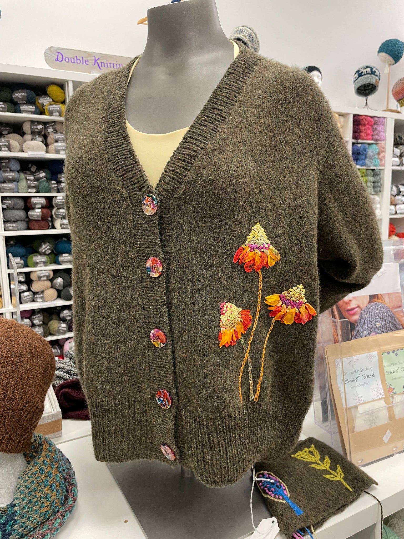 About your instructor: Catherine recently returned from attending knitting classes in Lyon, France, including one about embroidery on knits! She is the creator of the masterpieces pictured, the second of which is currently on display in the store.