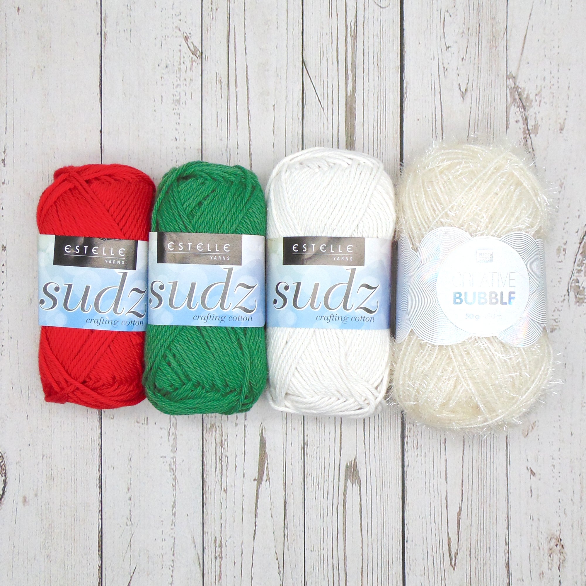 Each kit contains 3 assorted balls of Estelle Yarns' Sudz, along with one ball of Rico Design's Creative Bubble - enough yarn to make 3 perfectly coordinating Scrubbies - just add 4 mm needles!